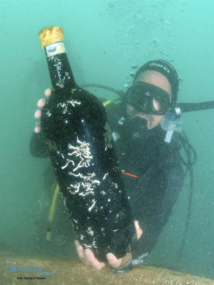Tras la inmersión se extrajo de las profundidades del mar una botella imperial atesorada en el mar con fines benéficos, para la organización WOP (Walk On Project).